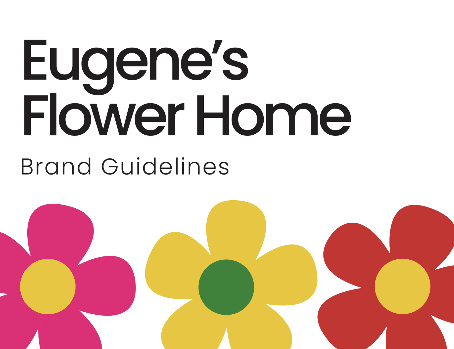 Designed brand guidelines with flower motifs, bold color palette, friendly type + tone, mockups & advertising examples in Adobe InDesign
