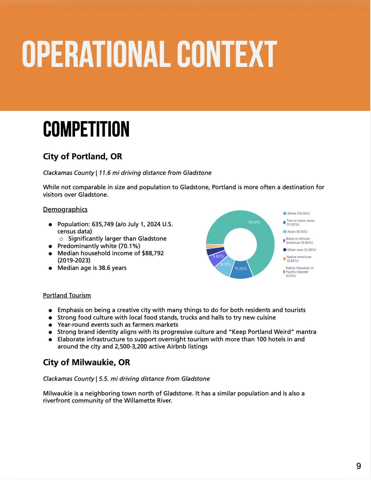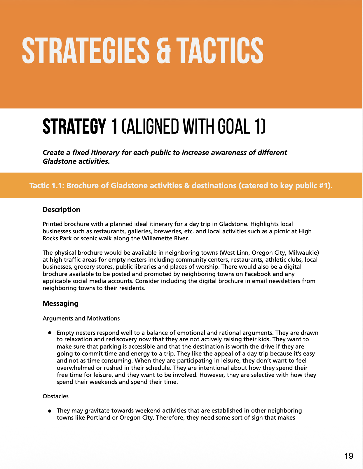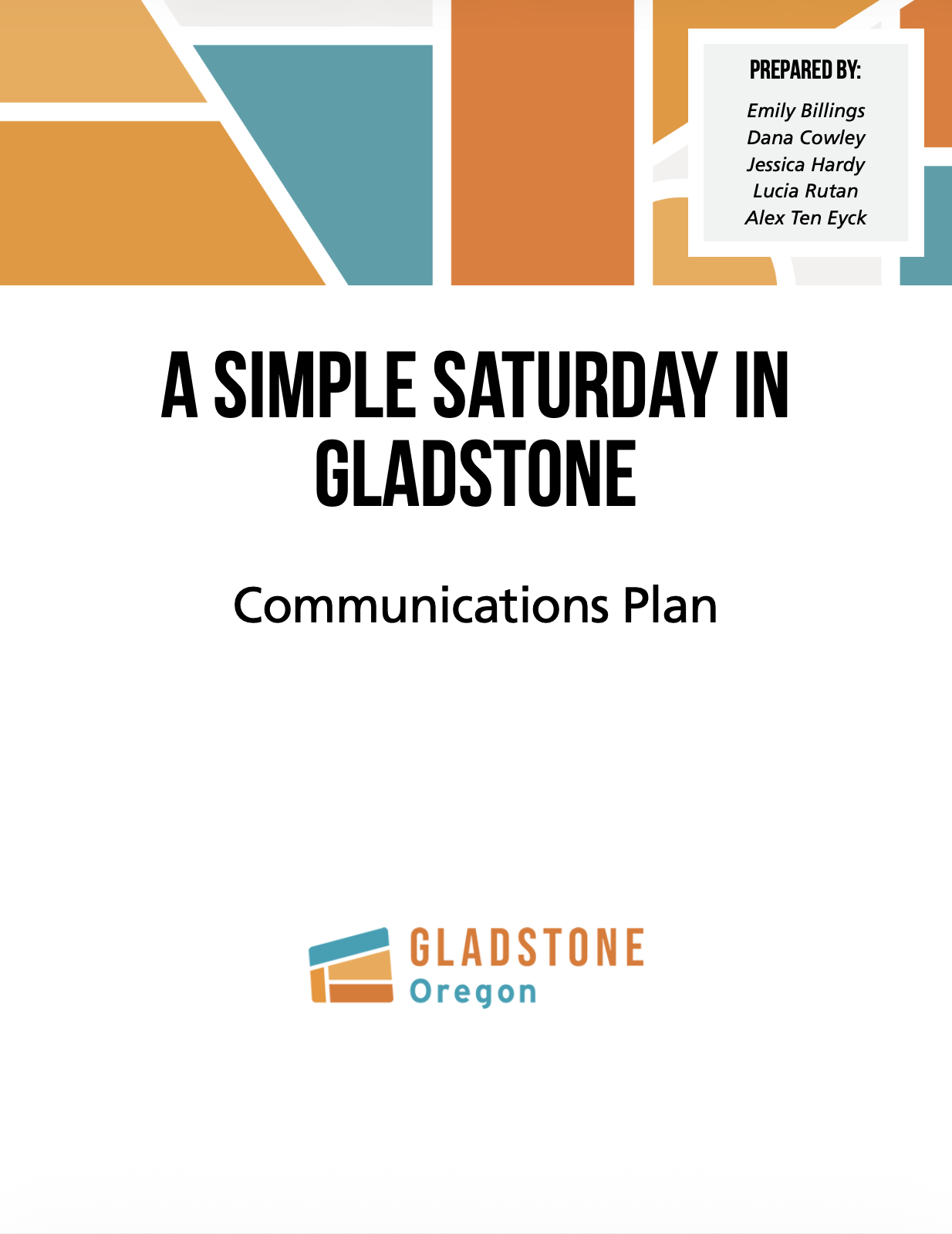 Team project to create a communications plan for the City of Gladstone, Oregon. Outlines research, goals & objectives, key publics, strategies & tactics, timeline, evaluation and budget to increase visitation to and positive reputation of Gladstone.