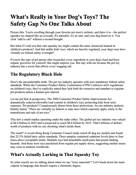Positions West Paw as a trusted source for nontoxic pet toys backed by scientific research. Utilized AI tools such as Perplexity for deep research & Claude to ensure consistent brand voice. All facts were checked and all edits were made by me.
